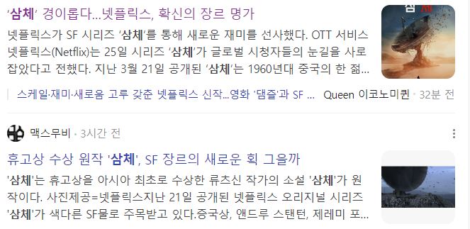 | [긴글주의] 넷플릭스 삼체 원작 소설 결말, 줄거리, 내용, 스포일러, 재미 (12) | 2024.04.08 |